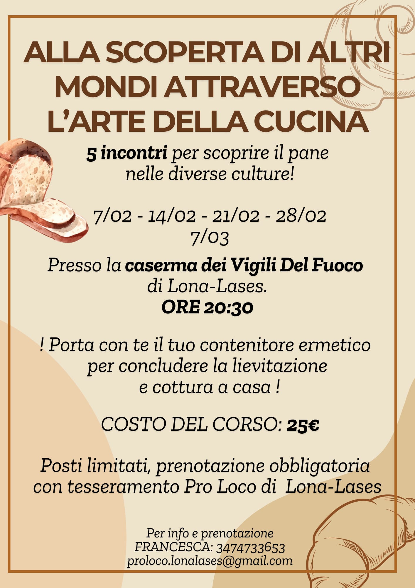 La Pro Loco di Lona - Lases organizza presso la caserma dei Vigili del Fuoco volontari di Lona Lases a partire da venerdì 07/02/2025 alle ore 20.30 una serie di 5 incontri per scoprire il pane nelle diverse culture. I posti sono limitati e la prenotazione obbligatoria con tesseramento alla Pro Loco di Lona - Lases. Si raccomanda di portare un contenitore ermetico per concludere la lievitazione e la cottura del pane a casa.